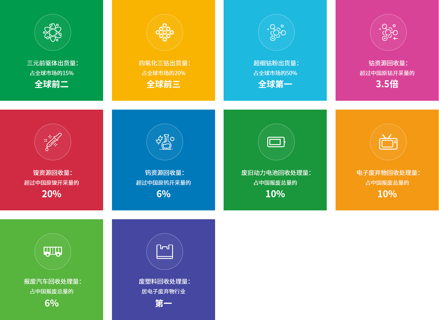 公司在中國11省市以及在南非、韓國、印尼等地建設了16個廢物循環處理工廠與新能源材料制造工廠,構建以中國主要城市為中心的城市礦山回收開采體系,綠色發展的足跡輻射世界、覆蓋中國40%以上國土面積,與超過5億人口建立廢物處理合作關系,循環再造鈷、鎳、鋰、銅、鎢、金、銀、鉑、鈀、銠、鎵、鍺、銦、稀土等30余種稀缺資源,年回收處理退役動力電池與電子廢棄物占中國總量的10%以上,年回收處理的報廢汽車占中國報廢總量的6%以上,年回收的鎳資源占中國原鎳開采量的20%以上,回收利用的鈷資源超過中國原鈷開采量的350%以上,回收的鎢資源占中國原鎢開采量的10%以上。