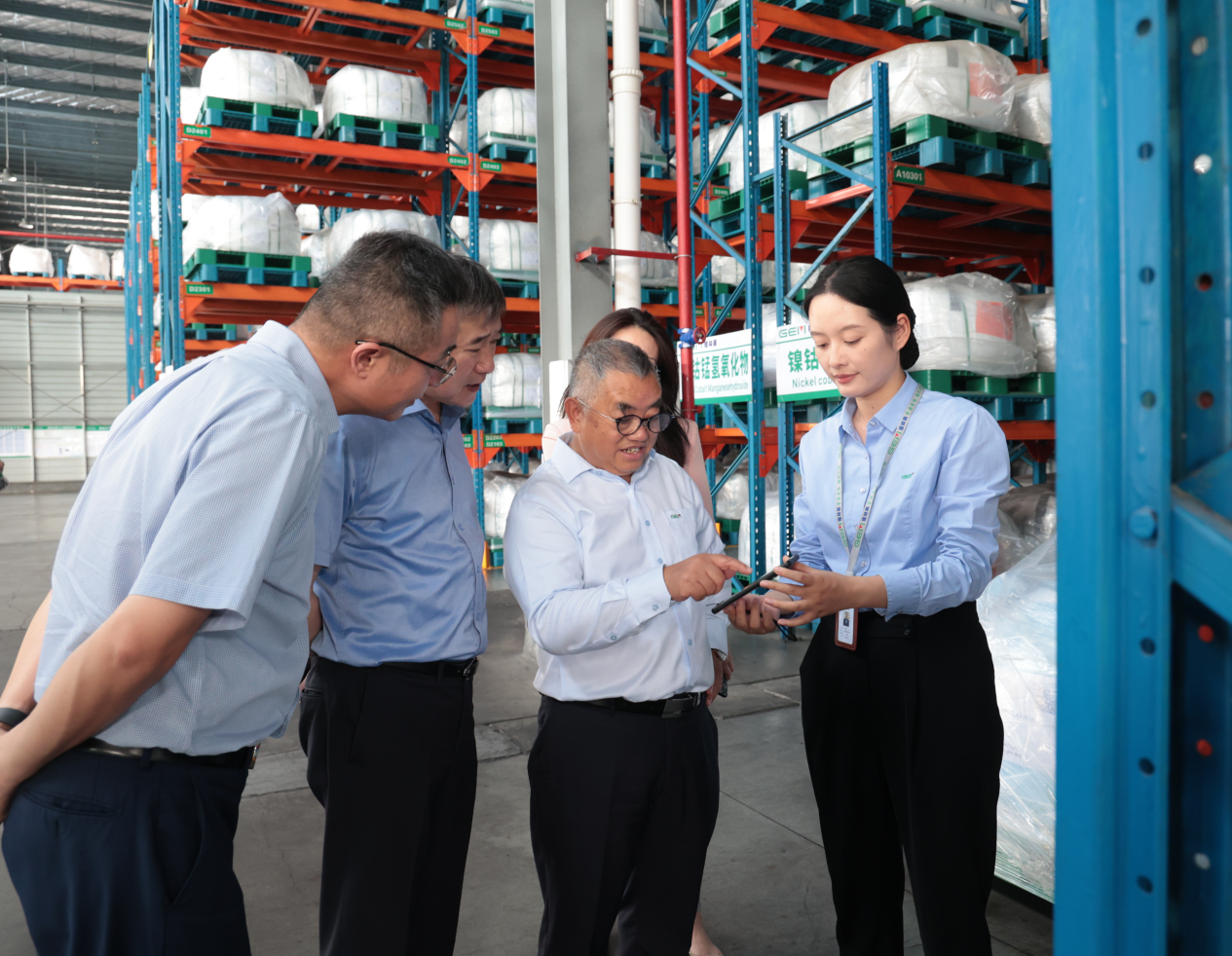 圖4 許開華董事長和陳忠行長(左二)察看格林美即將出口海外的鎳鈷產(chǎn)品