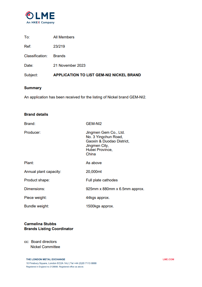 格林美電積鎳品牌GEM-NI2成功注冊于倫敦金屬交易所