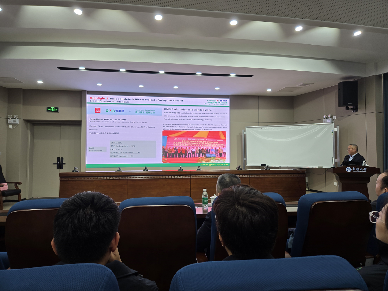 許開華董事長向留學生們展示格林美在印尼投資建設的青美邦新能源鎳資源項目、印尼本土企業控股的紅土鎳礦生產新能源材料項目、GEM-ITB-CSU中印尼萬隆聯合研究實驗室項目等格林美出海3大亮點工程。GEM-ITB-CSU中印尼萬隆聯合研究實驗室是目前全球最先進的冶金技術與新能源材料實驗室,在過去3個月里接待了來自全球8個國家、361人次的參觀,成功傳播了格林美“科技+文化”融合與綠色發展理念。許開華董事長還向同學們分享了自己未來的兩個夢想:一是將格林美建設成為世界一流的綠色產業集團,二是將與Vale在印尼共同投資建設世界級綠色、零碳的鎳資源產業園,提升印尼鎳資源的綠色價值與全球競爭力。