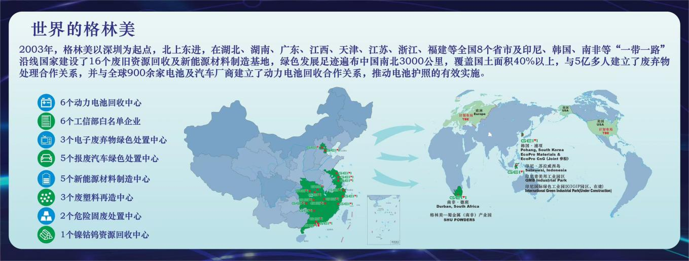 公司在中國8省市以及在南非、韓國、印尼等地建設了16個廢物循環處理工廠與新能源材料制造工廠,構建了以中國主要城市為中心的“城市礦山”開采體系,綠色發展的足跡輻射世界、縱橫中國3000公里,年回收處理退役動力電池占中國總量的10%以上,年回收處理的報廢汽車占中國報廢總量的6%以上,年回收的鎳資源占中國原鎳開采量的20%以上,成為推動循環型社會發展與踐行綠色發展理念的杰出代表。