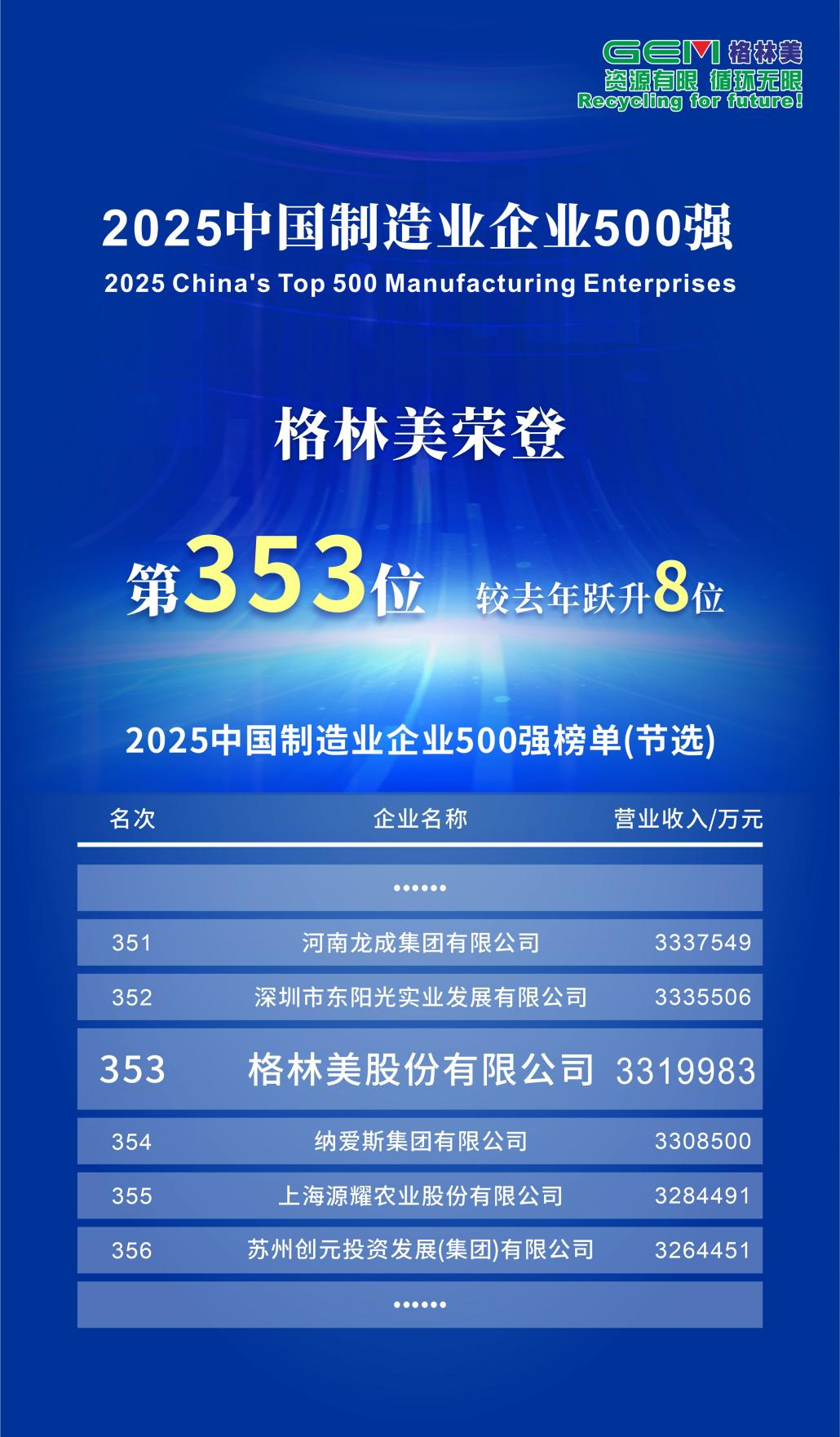 查看詳細9月20日,在世界制造業大會上,中國企業聯合會、中國企業家協會聯合發布2025中國制造業企業500強榜單。格林美位列第353位,較去年(第361位)上升8位。2024年,格林美在全球行業競爭中正確洞察局勢、精準出招、踏浪前行,推動公司成功跨越全球競爭挑戰期,實現產能大釋放,邁向增量新通道!