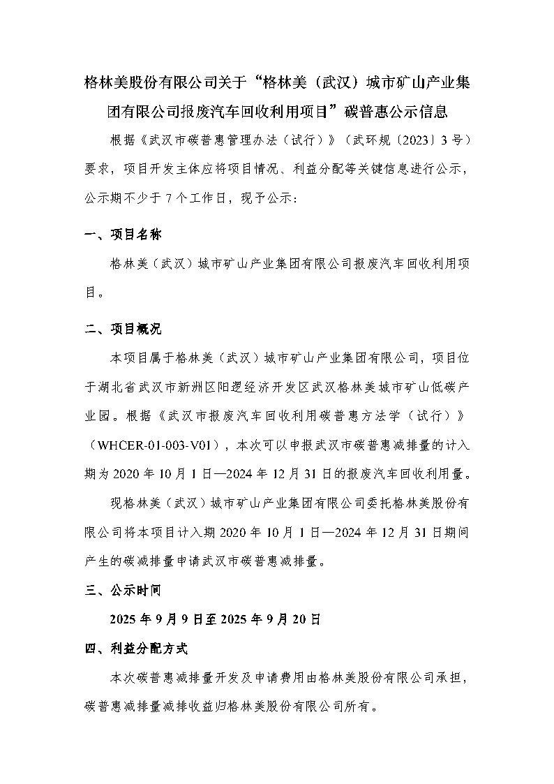 • 格林美股份有限公司關(guān)于“格林美(武漢)城市礦山產(chǎn)業(yè)集團(tuán)有限公司報(bào)廢汽車回收利用項(xiàng)目”碳普惠公示信息