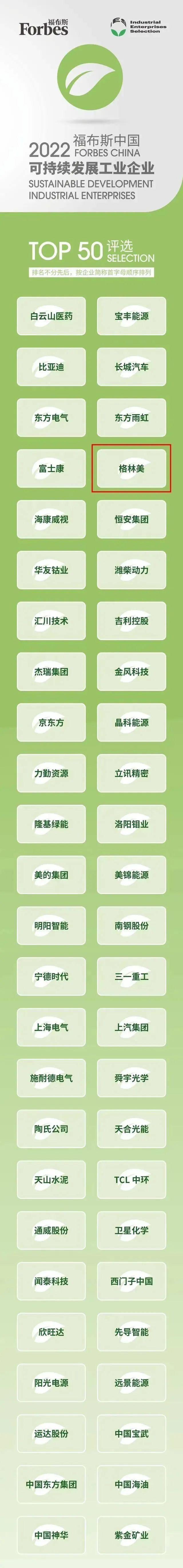 “2022福布斯中國可持續發展工業企業TOP50評選”名單