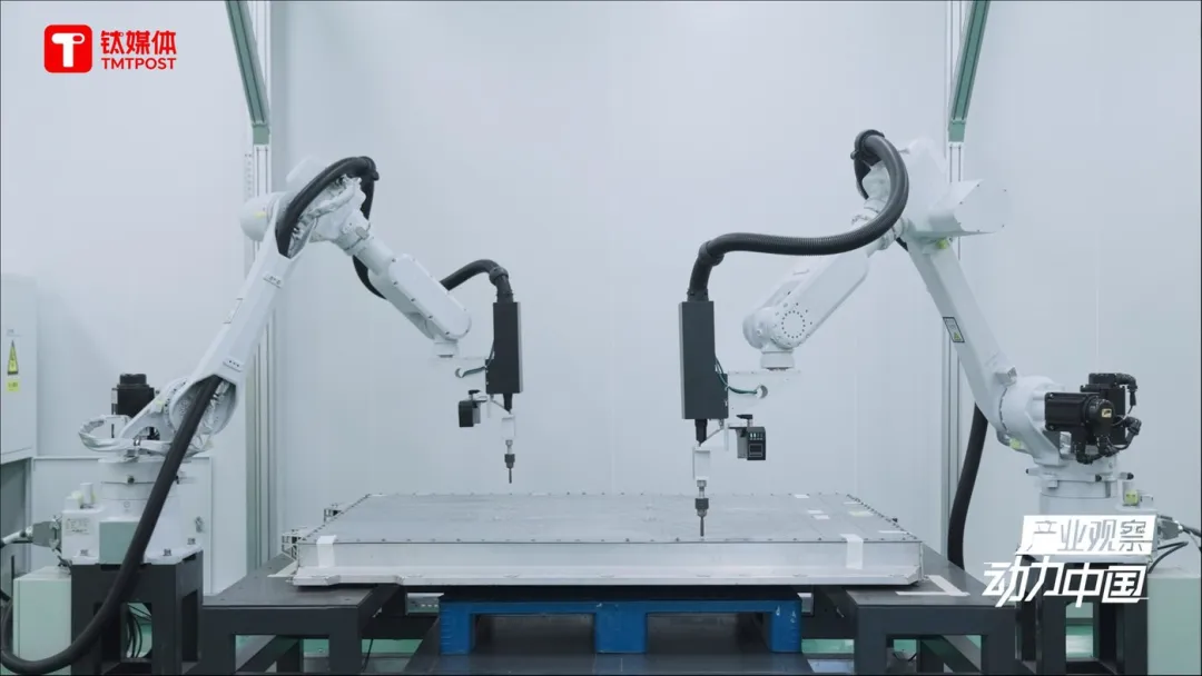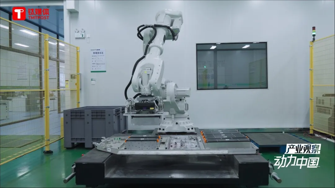 電池包的上蓋拆開后,工人處理完線束,機械臂將繼續(xù)介入,來完成電池包內(nèi)的模組搬運。