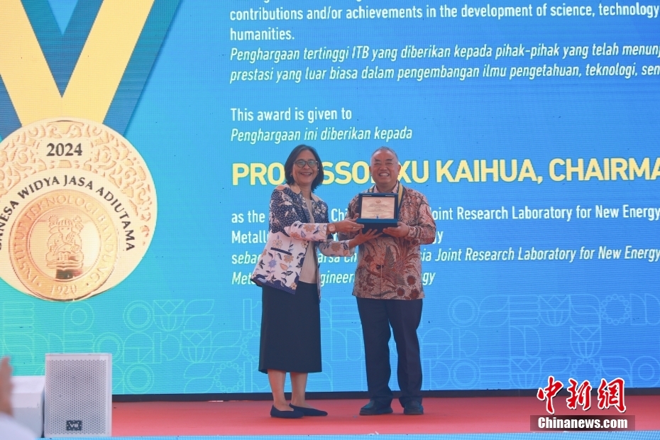 萬隆理工學院校長瑞麗(左)為格林美董事長許開華頒發學校榮譽獎。