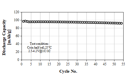 S-2500產品應用:用于方型或軟包電池,扣電4.20 V下測試,0.1C放電比容量為96.74 mAh/g,循環性能:1C/1C,50周≥90%,可用于電動自行車或電動工具。