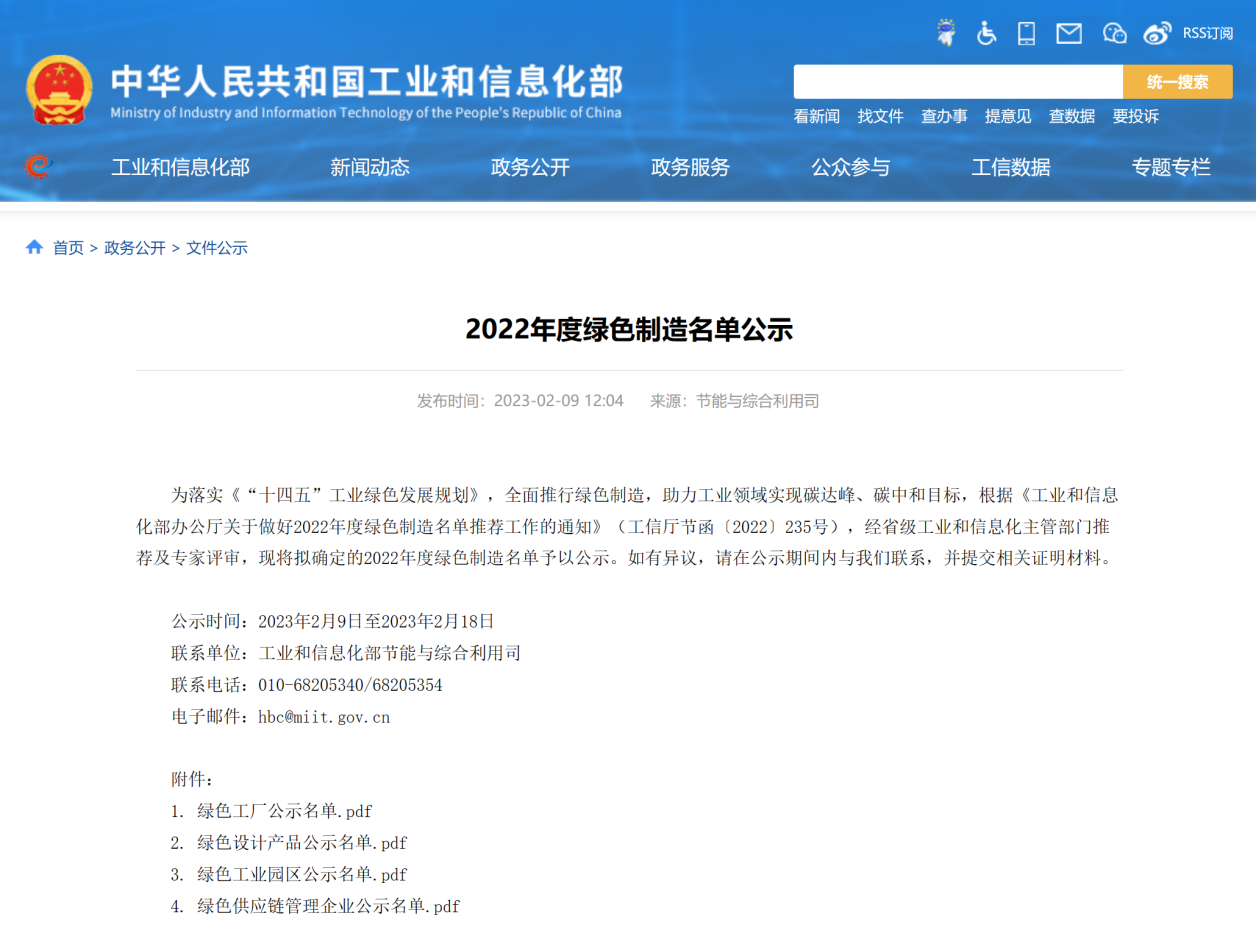 圖1 國家工信部公布2022年度綠色制造名單公示