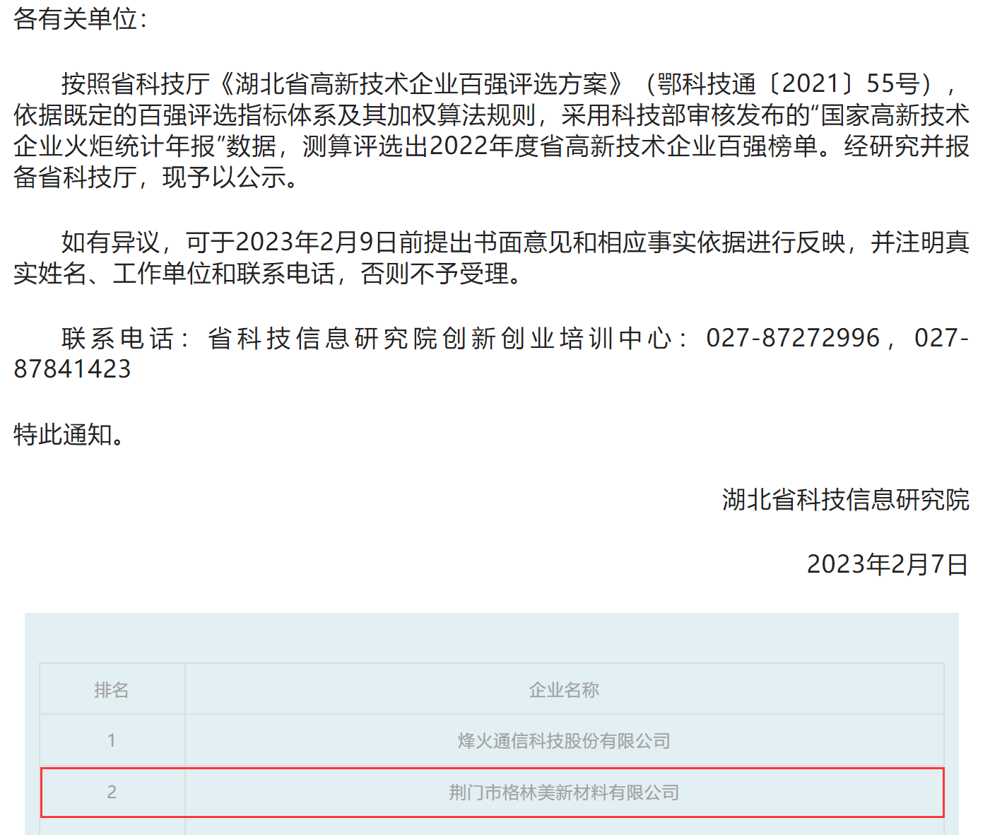 2月7日,湖北省科技信息研究院公布了2022年度省高新技術企業百強榜單,荊門市格林美新材料有限公司位列第二。