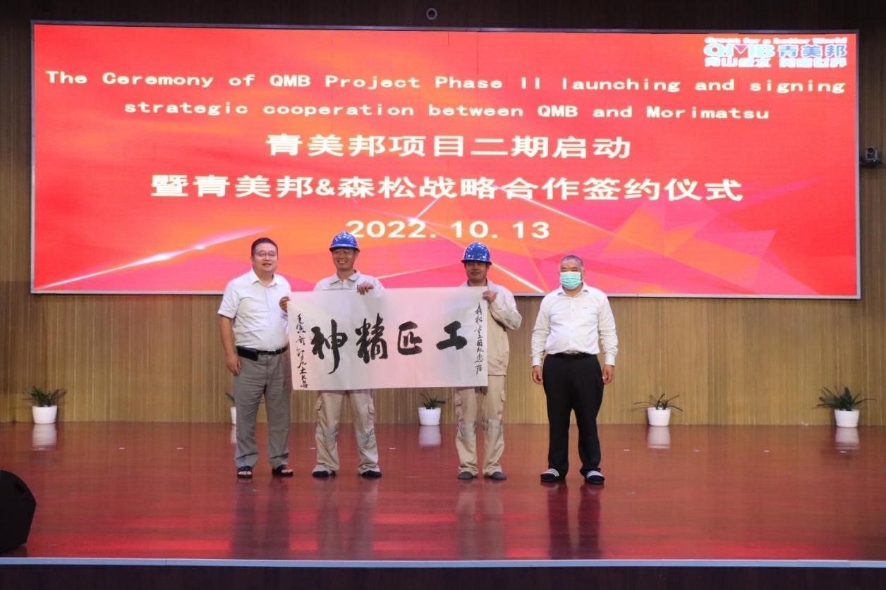 簽約儀式上,許開華董事長為森松集團頒發“卓越功勛獎”,感謝森松對青美邦項目一期建成做出的卓越貢獻,并為森松駐守青美邦現場的兩名優秀工匠送上親筆題字,對他們勇于出海助力青美邦項目建設表示贊許和感謝。