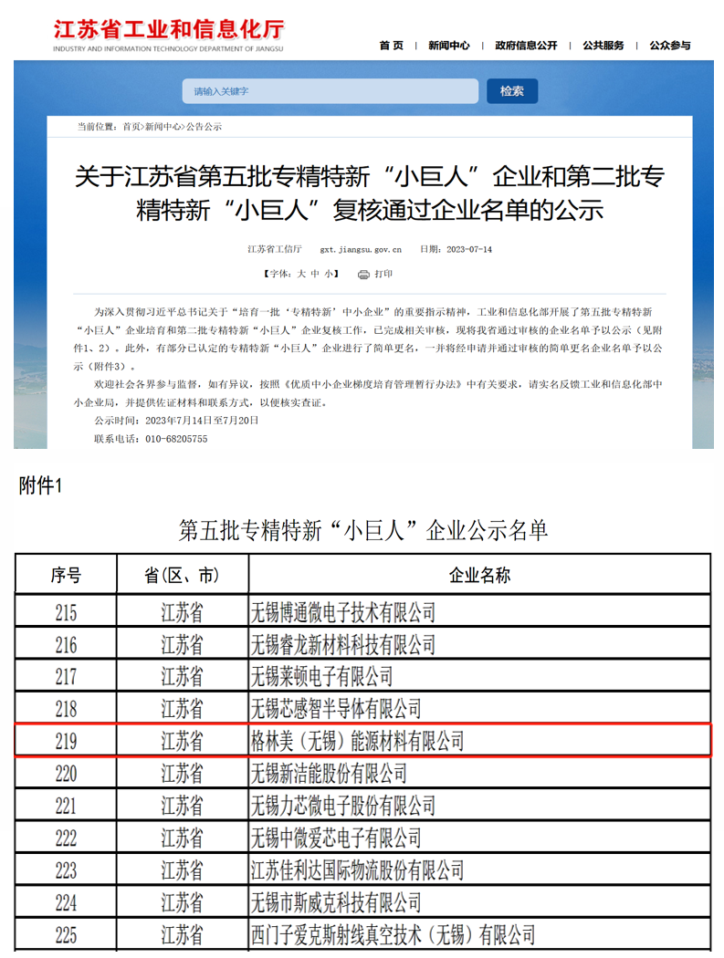 ▲ 無錫格林美入選江蘇省第五批專精特新“小巨人”企業